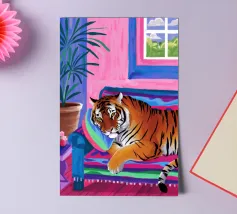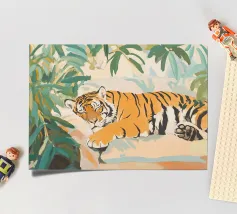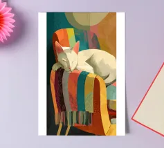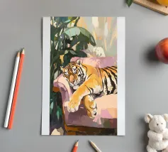 Un'opera d'arte serena e stravagante di un ghepardo che sonnecchia pacificamente su un divano vintage a righe bianche e verdi. I motivi vivaci e la postura accogliente del grosso felino creano un contrasto sognante e spiritoso tra la natura selvaggia e la rilassata vita domestica. Perfetto per gli amanti degli animali, i collezionisti d'arte eclettica e gli appassionati di estetica d'interni giocosa.