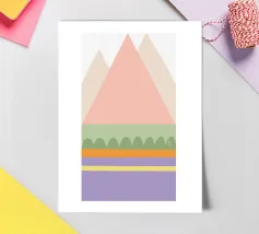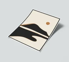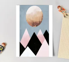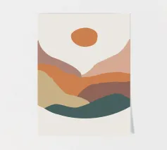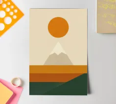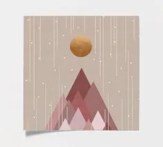 Le forme geometriche formano un paesaggio montano minimalista, con un cerchio in alto che ricorda il sole. Sotto è raffigurato un riflesso invertito delle cime, che crea un disegno simmetrico.