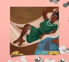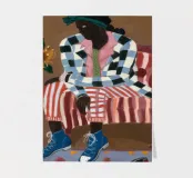 Questa opera d'arte mostra una persona seduta su una sedia a righe, circondata da girasoli e da una borsa verde. Lo sfondo è di un marrone tenue che crea un'atmosfera rustica e riflessiva.