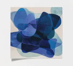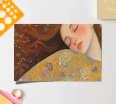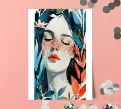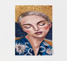 Un delicato ritratto di donna con fluenti capelli biondi o castano chiaro, con gli occhi chiusi o lo sguardo rivolto verso il basso, che indossa un abito blu e argento o bianco dai dettagli intricati che suggeriscono pizzi o armature.