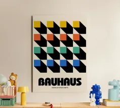 This dynamic design combines the powerful impact of geometric shapes with a vibrant colour palette of yellow, pink and blue. The cubic patterns appear to float three-dimensionally due to the contrasting arrangement and dark background colour, creating a hypnotic and modern look. The slogan "BE BOLD - From Another Point of View" emphasises the bold character of the design and invites you to take on new perspectives.