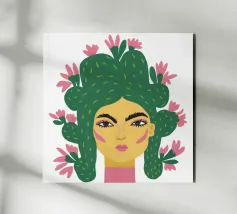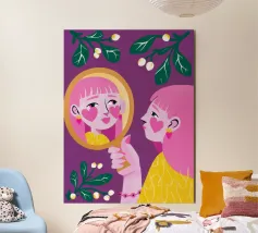 Il dipinto raffigura una persona con capelli corti e scuri acconciati a onde, che indossa un abito con motivi retrò e cerchi e diamanti nei toni del rosa, del marrone e del beige. Lo sfondo è di un semplice colore beige chiaro.