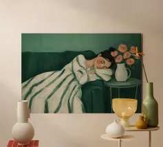 Questo ritratto contemporaneo cattura un momento di tranquilla introspezione grazie a texture pittoriche morbide e a una tavolozza di colori contenuta. La figura femminile, resa con pennellate delicate e sottili contrasti, emerge da toni verdi stratificati che evocano calma e profondità emotiva. I segni verticali e le delicate lumeggiature aggiungono ritmo e atmosfera, mentre la posa rilassata suggerisce vulnerabilità e consapevolezza di sé. In equilibrio tra chiarezza figurativa e astrazione espressiva, quest'opera d'arte è ideale per interni moderni, illustrazioni editoriali o stampe di belle arti che celebrano l'immobilità, la femminilità e la riflessione.
