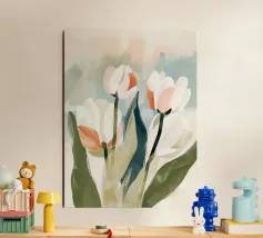 An expressive floral composition where color and emotion unfold together. Soft peach and deep red blooms rise against layered greens and sky tones, capturing the feeling of something gently beginning. This artwork reflects love, hope, and connection in their earliest form—ideal for interiors that embrace warmth, optimism, and emotional depth.