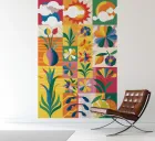 A vibrant patchwork of different patterns and motifs, combining floral elements, abstract shapes, and tiled designs. The eclectic mix of colors and styles creates a visually rich and joyful composition, reminiscent of a Mediterranean tile wall.