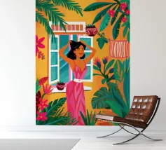 A delicious stack of golden brown pancakes, topped with a melting pat of butter and drizzled with syrup, is the star of this artwork. Presented with colorful mugs, the illustration is a mouth watering celebration of a classic, beloved breakfast treat.