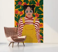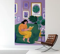 A woman lies upside down on a pink sofa, with her legs in the air, on a checkered floor. The composition is playful, quirky, and a fun, modern depiction of carefree, youthful relaxation.