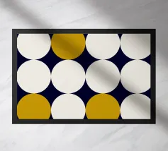 Audaci motivi geometrici si intrecciano con un sorprendente accento giallo in un design che enfatizza il contrasto. Le forme curve e angolari in bianco e nero creano un flusso visivo dinamico.