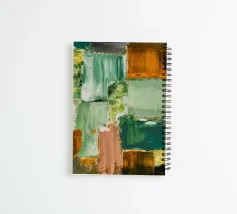 Un'opera d'arte astratta con una disposizione rilassante di macchie quadrate e rettangolari in varie tonalità di verde, marrone e beige, che ricordano un campo sereno e patchwork o una superficie tranquilla e strutturata. Stile Bob Nugent.