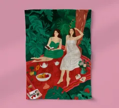 Una composizione astratta audace e moderna presenta una disposizione dinamica di forme sovrapposte in rosa, blu navy e nero, con dettagli strutturati che creano un pezzo sofisticato e grafico.