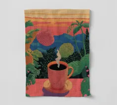 Un'illustrazione semplice e confortante di una tazza rosa di caffè o tè fumante, appoggiata a una finestra con vista sul sole che sorge. La scena cattura perfettamente il calore e la speranza di un nuovo mattino.