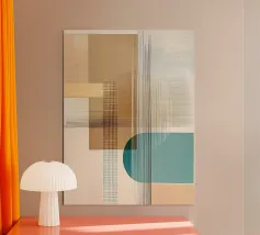 Una moderna stampa astratta di arte digitale con una composizione di linee verticali in una tavolozza di colori rilassanti di blu, verde acqua, marrone e beige tenui. Le linee variano in larghezza e tono, creando un senso di profondità e ritmo, mentre le linee orizzontali sottili e ampie aggiungono un contrasto dinamico. Questo pezzo evoca una sensazione di calma e raffinatezza, rendendolo un'aggiunta perfetta a spazi abitativi contemporanei, uffici o camere da letto.