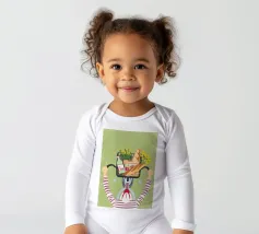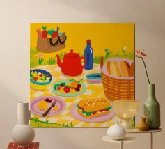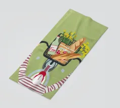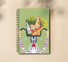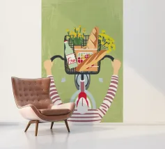 Illustrazione di una persona con una camicia a righe che va in bicicletta con un cestino pieno di pane fresco, generi alimentari e una pianta. L'immagine è un'affascinante e gioiosa celebrazione di una vita semplice e sostenibile.