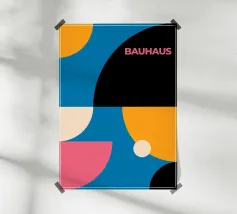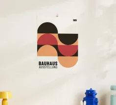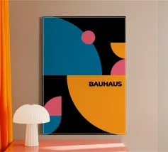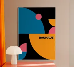 Un poster astratto audace e vibrante che presenta una composizione dinamica e sovrapposta di forme geometriche su un sorprendente sfondo nero. La tavolozza dei colori è caratterizzata da blu elettrico, rosa caldo e arancione brillante, che creano un elevato contrasto e un'energia visiva. Grandi semicerchi e archi dominano la cornice, con dettagli circolari più piccoli che aggiungono punti focali. La parola "BAUHAUS" è ben centrata nella metà inferiore, in caratteri puliti e sans-serif. Quest'opera d'arte è un'interpretazione moderna dell'astrazione geometrica e dei principi del design modernista. Il formato digitale ad alta risoluzione (7000x5000 pixel,
