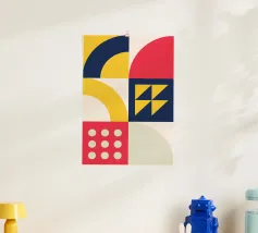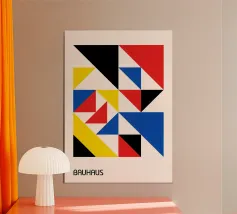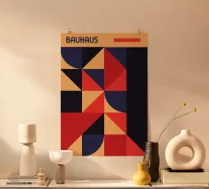 Uno straordinario poster astratto nella tradizione geometrica e audace del Bauhaus e di De Stijl. La composizione è un fitto intreccio di triangoli e quarti di cerchio che crea un senso di movimento e profondità. La ricca tavolozza di colori è caratterizzata da un profondo blu navy, un rosso intenso e un caldo pesca/ocra, che creano un equilibrio visivo dinamico. La parola "BAUHAUS" è visualizzata in modo chiaro su una fascia ocra nella parte inferiore. Questa arte digitale di alta qualità (7000x5000 pixel, 300 dpi) garantisce una nitidezza eccezionale e una riproduzione vibrante dei colori, rendendola un pezzo perfetto e di grande impatto per gli interni moderni.