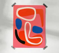 Forme astratte sono disposte su uno sfondo chiaro, creando una composizione che suggerisce un profilo facciale frammentato. Colori vivaci come il blu, l'arancione e il nero sono utilizzati per gli elementi geometrici, in contrasto con il sottile sfondo.