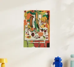 Un'energica composizione astratta in cui audaci forme geometriche, linee e motivi in arancione, verde acqua e nero si scontrano e si sovrappongono, creando un senso di movimento dinamico.
