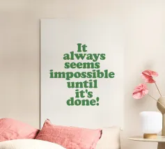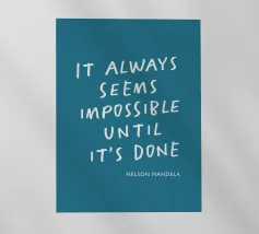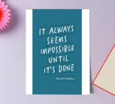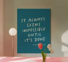 Portate l'ispirazione nel vostro spazio con questa stampa d'arte di Nelson Mandela, che riporta la frase edificante "It Always Seems Impossible Until Its's Done" (Sembra sempre impossibile finché non viene fatto) in un'incantevole scritta bianca disegnata a mano su un rassicurante sfondo blu. Questo disegno unico fonde speranza e incoraggiamento, rendendolo un regalo appropriato per compleanni, lauree o nuovi inizi. La scrittura giocosa e innocente e la sorprendente tonalità di blu creano un pezzo distintivo per qualsiasi casa, ufficio o studio, ideale per chiunque cerchi positività quotidiana e un promemoria di perseveranza.