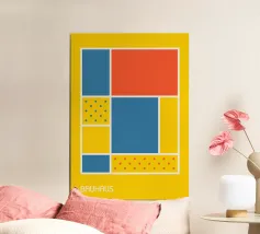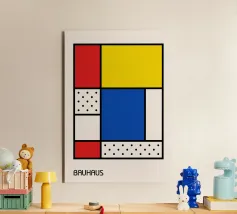 Una sorprendente composizione astratta che fonde la funzionalità del Bauhaus con l'estetica a griglia del De Stijl di Piet Mondrian. Il design è caratterizzato da linee nere spesse e decise che dividono la tela in vari blocchi rettangolari, riempiti con i colori primari (rosso, giallo, blu), il bianco e due sezioni con un elegante motivo a pois neri. Questo pezzo celebra la forma geometrica pura e la teoria del colore. Il poster digitale premium viene consegnato con una risoluzione superiore di 7000x5000 pixel, 300 dpi, garantendo una qualità di stampa eccellente per un'aggiunta d'arte moderna straordinaria.