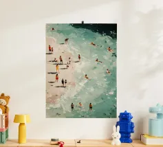 Questo sereno disegno aereo presenta una scena di spiaggia dai toni pastello, punteggiata da ombrelloni multicolori e piccoli bagnanti sparsi sulla sabbia soffice. Le delicate onde verde acqua rotolano in strati ritmici lungo la riva, creando uno sfondo rilassante per il rilassato tableau estivo. La tavolozza pastello e la texture pittorica conferiscono all'immagine una qualità sognante, quasi impressionistica. Ideale per camere da letto, studi o uffici, questa stampa genera un senso di serena nostalgia vacanziera e di estro artistico. Perfetta per tutti coloro che amano la dolce bellezza del mare e le sottili armonie di colore.