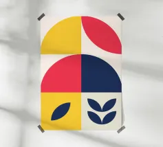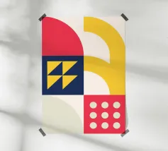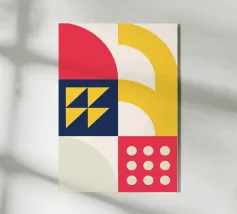 Un poster astratto di grande impatto che utilizza una griglia modulare e una vivace combinazione di colori di ispirazione primaria, con un rosso deciso, un giallo brillante e un blu marino intenso. La composizione presenta sezioni contrastanti, tra cui un grande arco giallo, un quadrato blu scuro con quattro triangoli gialli, un semicerchio rosso e un blocco rosso con una griglia di nove cerchi bianchi. Il gioco di forme geometriche curve e taglienti crea un design dinamico e strutturato, che riflette perfettamente l'etica Bauhaus e Mid-Century Modern. Questo download digitale ad alta risoluzione (7000x5000 pixel, 300 dpi) garantisce un'immagine nitida e chiara.