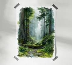 La luce del sole filtra attraverso una foresta lussureggiante creando un'atmosfera serena. carta hahnemühle