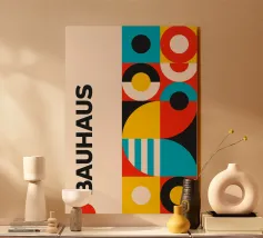 Questo poster dinamico presenta una vibrante colonna verticale di forme geometriche interconnesse, che incarna lo spirito del movimento Bauhaus. La composizione è costruita su una griglia, utilizzando audaci colori primari (rosso, giallo e blu/ciano) con il bianco e il nero per creare un suggestivo motivo astratto di cerchi, semicerchi e strisce. Il lato sinistro è un margine color crema con la parola "BAUHAUS" resa in caratteri tipografici grandi e maiuscoli. Questo poster digitale di qualità superiore viene fornito a una risoluzione eccezionale di 7000x5000 pixel, 300 dpi, che garantisce dettagli nitidi e una stampa a colori vivaci. Tags :