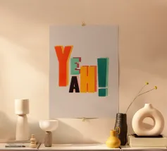 Un grande e audace YEAH! per rallegrare la vostra giornata. Questa divertente stampa d'ispirazione rétro mescola lettere grosse e colori non abbinati per creare una perfetta atmosfera imperfetta: pensate a poster vintage e ritagli di collage. Con arancioni caldi, gialli solari, verdi menta e tenui colori pastello, è un vero toccasana per l'umore. Che lo appendiate nel vostro studio, nel corridoio o sopra la scrivania, è qui per portare buona energia e un po' di caos creativo nel modo migliore. Da showmemars