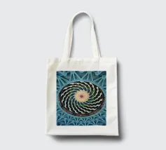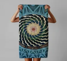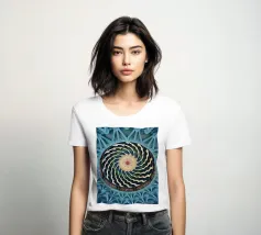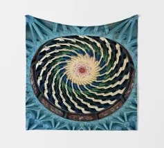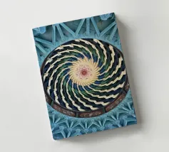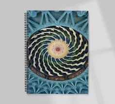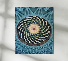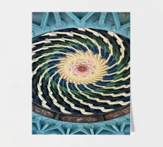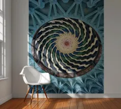 Un vivace e intricato motivo a spirale domina il soffitto, creando un'illusione ottica ipnotica con i suoi colori vorticosi e il suo disegno geometrico. Elementi architettonici nelle tonalità del blu incorniciano il motivo centrale, aggiungendo profondità e un senso di grandezza.