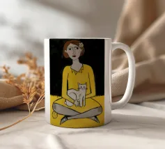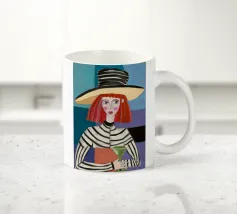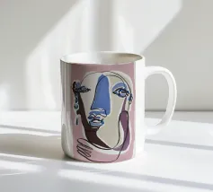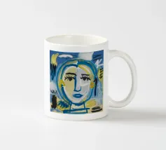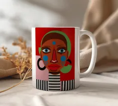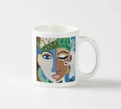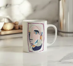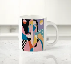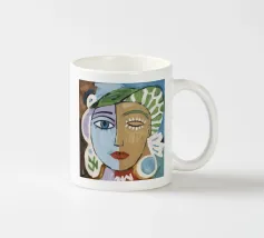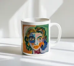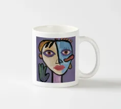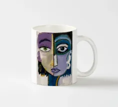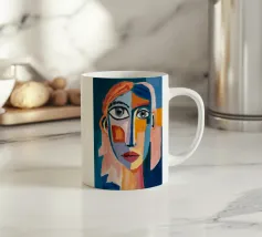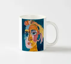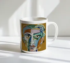 Questa opera d'arte presenta un volto astratto frammentato con linee decise e un mix di colori nero, bianco e giallo. Lo sfondo è pieno di forme geometriche, che si aggiungono al tema astratto generale.
