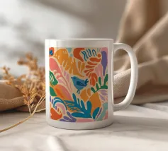Una composizione botanica audace e grafica presenta un grande ramo stilizzato di foglie rosse arancioni su uno sfondo di forme astratte, creando una dichiarazione potente e moderna.