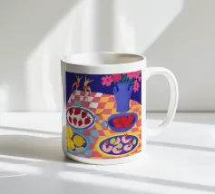 Una composizione botanica audace e grafica presenta un grande ramo stilizzato di foglie rosse arancioni su uno sfondo di forme astratte, creando una dichiarazione potente e moderna.