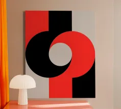 A striking abstract composition inspired by Bauhaus design, featuring bold red and black geometric forms arranged in a dynamic balance. Clean lines and strong contrasts create a timeless modern aesthetic.