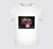 Una brocca bianca contiene un abbondante e traboccante bouquet di fiori in un tripudio di colori rosa, viola, rossi e gialli, dipinti in uno stile ricco, scuro e lunatico che sembra al tempo stesso classico ed espressivo.