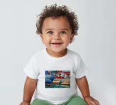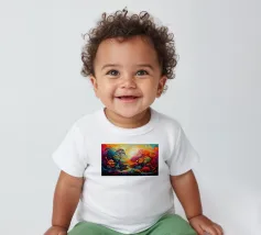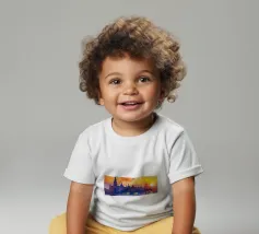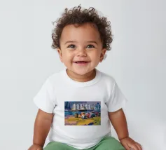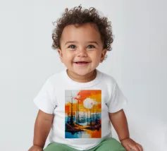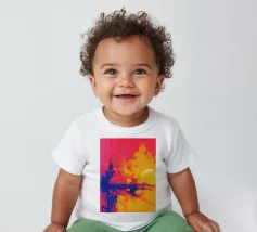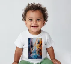 Quadro astratto dinamico che presenta un'architettura surreale, vivaci toni arancioni e blu, alberi astratti e sfere fluttuanti in un paesaggio fantastico. I tratti strutturati e i contrasti decisi creano un'atmosfera onirica ed energica.