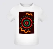 Un audace disegno astratto è caratterizzato da cerchi concentrici rossi e verdi, circondati da punti verdi. Due linee arancioni ondulate aggiungono un movimento dinamico alla composizione.