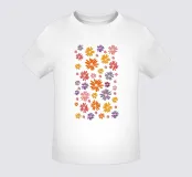Un motivo floreale giocoso che sembra una passeggiata visiva in un festival di giardini retrò: I fiori stilizzati, nei colori arancione, rosa, viola, rosso e giallo, danzano liberamente. Ogni fiore ha una forma semplice, simile a una margherita, con lunghi petali a raggiera che emergono da un punto centrale. La disposizione è volutamente irregolare, come un disegno sparso di gioia, estate e nostalgia.