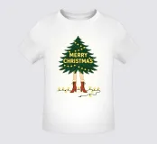 Divertente arte natalizia di una donna che indossa stivali da Babbo Natale e cerca di montare un albero di Natale. Le luci fiabesche cadono a terra mentre lei indossa l'albero di Natale.
