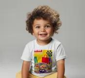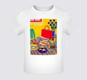 Una vivace illustrazione di una tavola imbandita con un'abbondante e colorata varietà di cibo, tra cui sushi e borse della spesa. La scena è una rappresentazione gioiosa dell'abbondanza e di un pasto soddisfacente dopo lo shopping.