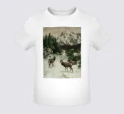 Un suggestivo motivo invernale: tre cervi si ergono maestosi in un paesaggio montano innevato, con abeti e cime sullo sfondo. I colori naturali e l'atmosfera tranquilla rendono questo disegno perfetto per gli amanti della natura e degli animali. Che si tratti di un murale, di un cuscino, di una tazza o di un poster, questo motivo porta il romanticismo invernale della fauna selvatica, l'eleganza e la tranquillità in ogni casa.