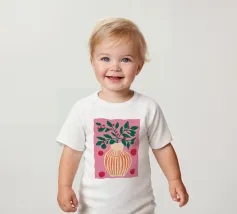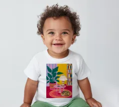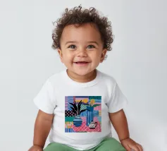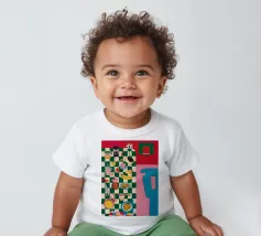 Una natura morta moderna ed eclettica con un paralume a scacchi, un vaso a zig zag e un fiore stilizzato. I motivi e le forme audaci creano una composizione divertente, grafica e di grande stile.