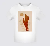 Illustrazione minimalista dai toni caldi della terra. Una mano stilizzata si protende verso il sole, mentre le foglie morbide sullo sfondo aggiungono un senso di equilibrio e natura. L'opera d'arte trasmette semplicità, serenità e una tranquilla connessione con il mondo naturale.