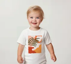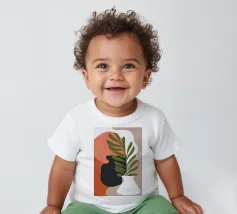 Il design minimalista è caratterizzato da una semplice pianta in vaso con foglie scure, contrapposta a forme astratte e sovrapposte nei toni terrosi del rosso, del grigio e del bianco. Le linee pulite e i blocchi di colore decisi creano un'estetica moderna e rilassante.