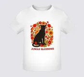 Sagoma di pantera nera circondata da fiori arancioni e rossi. Tavolozza calda, motivo floreale caratteristico; ideale per progetti audaci, tessuti grafici e accessori.