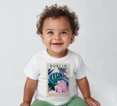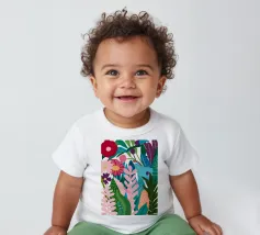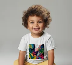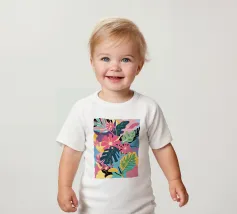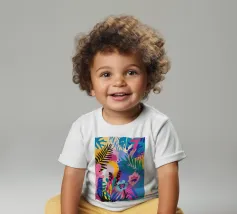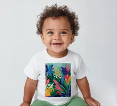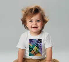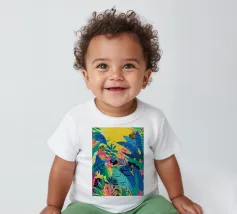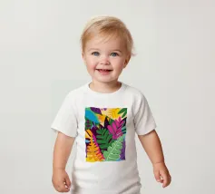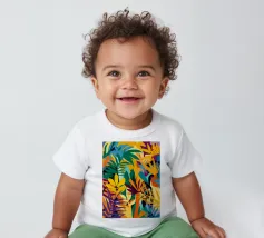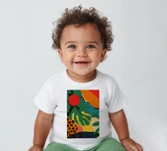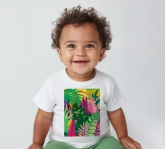 Una lussureggiante scena di giungla incornicia un grappolo d'uva viola, creando una natura morta unica e inaspettata che fonde il fogliame tropicale con la frutta del frutteto in una composizione vibrante.