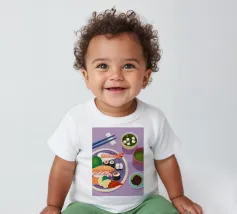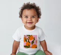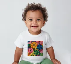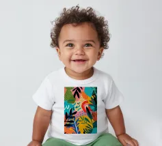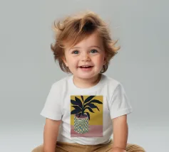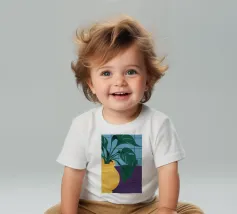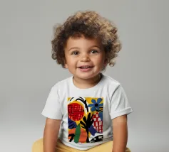 Una composizione astratta presenta una ciotola di fragole in mezzo a un turbinio di forme e motivi organici e colorati, creando un'interpretazione fresca e moderna di un classico dell'estate.