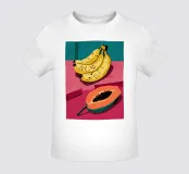Un'illustrazione audace e ispirata alla pop art di banane e papaya su un piatto rosso brillante. I colori ad alto contrasto e lo stile grafico creano una dichiarazione vibrante e giocosa.