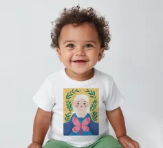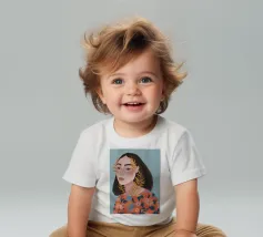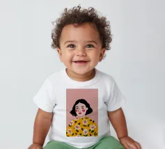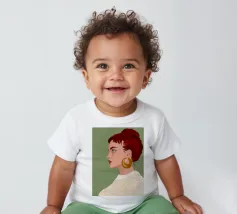 Il dipinto raffigura una persona con capelli corti e scuri acconciati a onde, che indossa un abito con motivi retrò e cerchi e diamanti nei toni del rosa, del marrone e del beige. Lo sfondo è di un semplice colore beige chiaro.