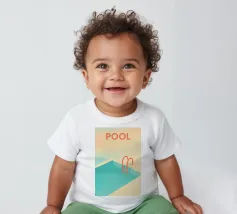 Poster raffigurante una piscina estiva con una scala arancione e riflessi d'acqua stilizzati. Un gioco di ombre, luci grafiche e una tavolozza solare. Perfetto per un look vintage e rinfrescante.