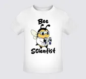 Una simpatica ape in camice e occhiali tiene in mano due provette piene di pozioni colorate. L'illustrazione gioca sul gioco di parole "Bee Scientist", unendo scienza e simpatia in un'unica immagine. Perfetto per chi ama la biologia, la chimica o semplicemente le api con un look da scienziato!